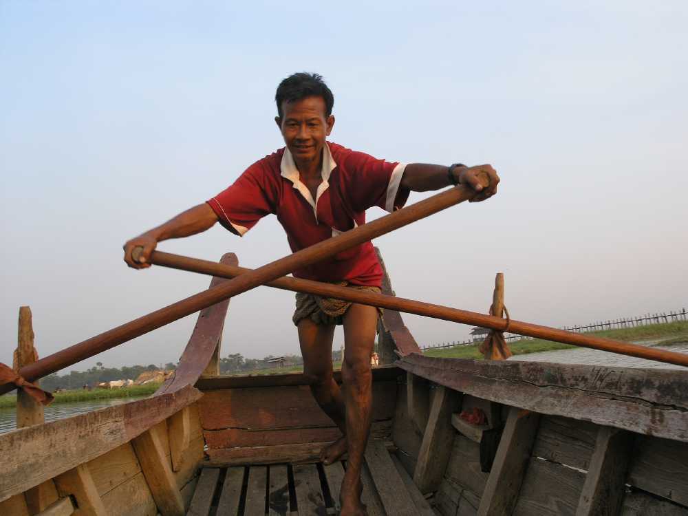 Rowing a small boat in Mandalay near U-Bein bridge |